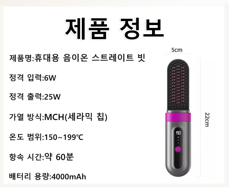 ● 강력한 음이온 방출로 모발의 정전기를 효과적으로 억제하고, 윤기 있고 부드러운 머릿결을 선사합니다. ● 휴대가 간편한 컴팩트한 디자인으로 언제 어디서나 손쉽게 스타일링이 가능하여 바쁜 현대인에게 필수 아이템입니다. ● 고온 세라믹 코팅 빗살이 머리카락 손상 없이 자연스럽게 펴주며, 두피 마사지 효과로 건강한 모발 관리에 도움을 줍니다. ● USB 충전식으로 무선 사용이 가능해 여행, 출근 등 다양한 상황에서 실용성을 극대화했습니다. ● 사용이 간편한 원터치 버튼과 인체공학적 그립감으로 초보자도 쉽게 전문가처럼 스타일링할 수 있습니다.