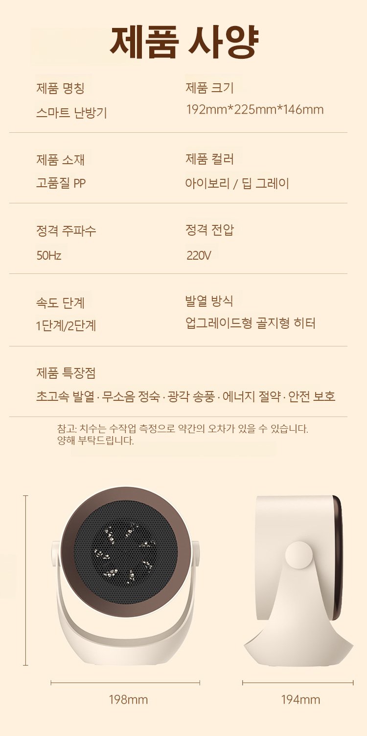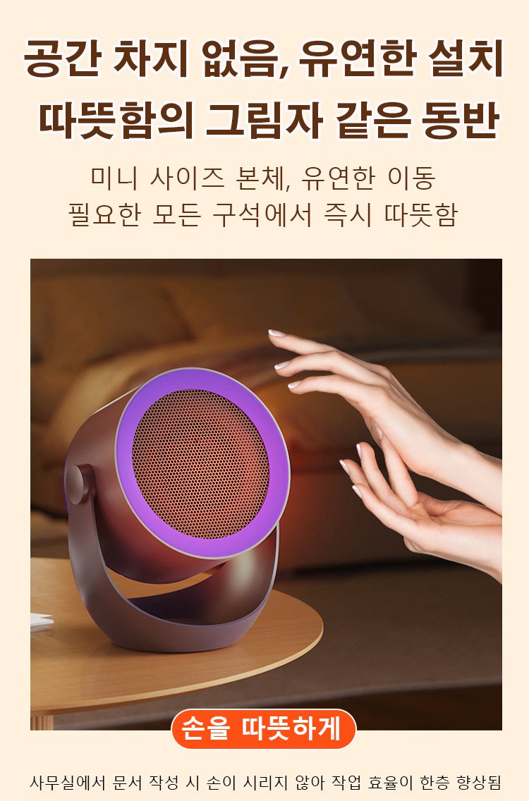 ● 다기능 초고속 온풍기는 강력한 난방 성능과 다양한 기능을 갖추어 겨울철 실내 공간을 빠르게 따뜻하게 만들어줍니다. ● 에너지 효율이 뛰어나 전기료 부담을 줄여주며, 조용한 작동 소음으로 언제 어디서나 쾌적하게 사용할 수 있습니다. ● 컴팩트한 디자인과 가벼운 무게로 이동이 간편하며, 안전장치 탑재로 아이와 반려동물 있는 가정에서도 안심하고 사용 가능합니다. ● 원터치 조작과 다양한 온도 설정 기능으로 사용자의 편의성을 극대화하여 누구나 쉽게 사용할 수 있습니다. ● 공기 청정 및 제습 기능까지 더해져 사계절 내내 쾌적한 환경을 유지할 수 있는 올인원 제품입니다.