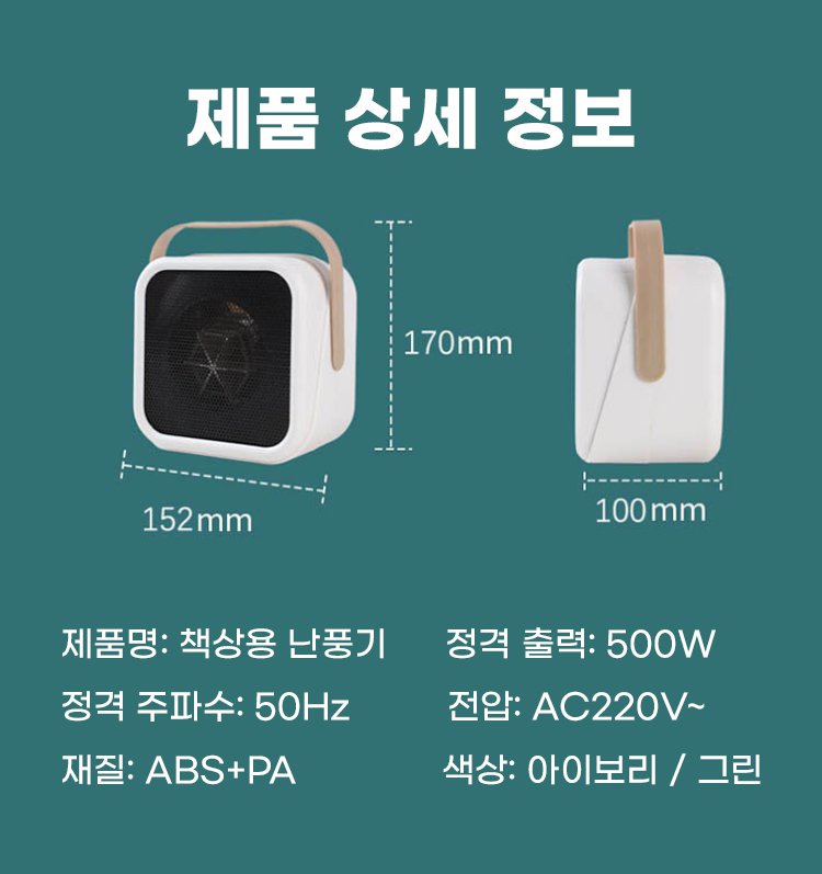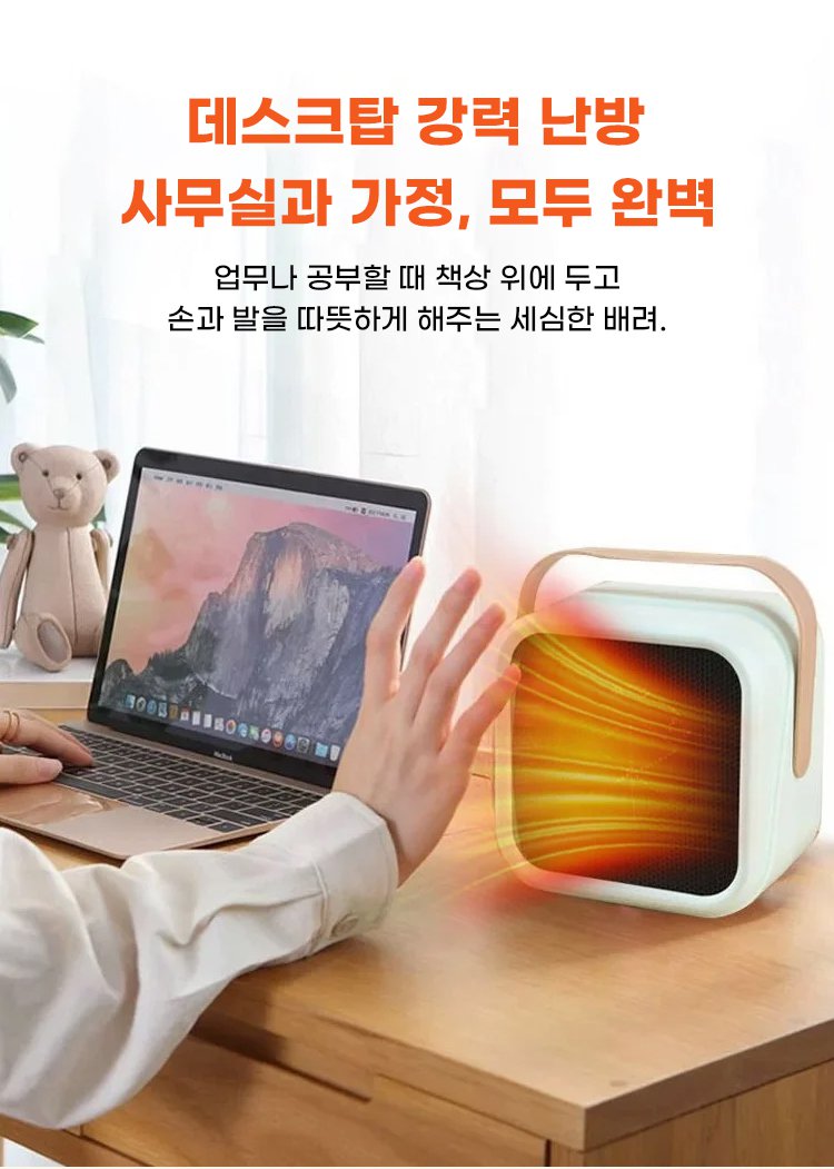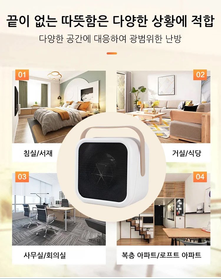 ● 컴팩트한 미니 사이즈로 집안 어디서나 간편하게 이동하며 사용할 수 있는 가정용 히터입니다. ● 빠른 난방 기능으로 추운 겨울에도 즉각적으로 따뜻한 공간을 만들어 쾌적한 실내 환경을 제공합니다. ● 저소음 설계와 에너지 효율이 뛰어나 장시간 사용에도 전기료 걱정 없이 사용할 수 있습니다. ● 안전장치가 내장되어 있어 과열 시 자동으로 전원이 차단되어 안심하고 사용할 수 있습니다. ● 세련된 디자인으로 거실, 침실, 사무실 등 다양한 공간에 잘 어울리며 인테리어 효과도 뛰어납니다.