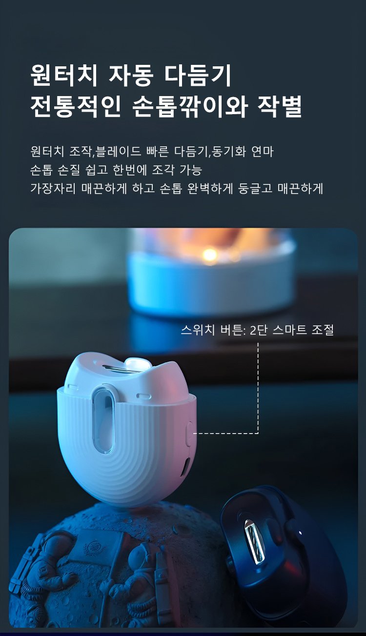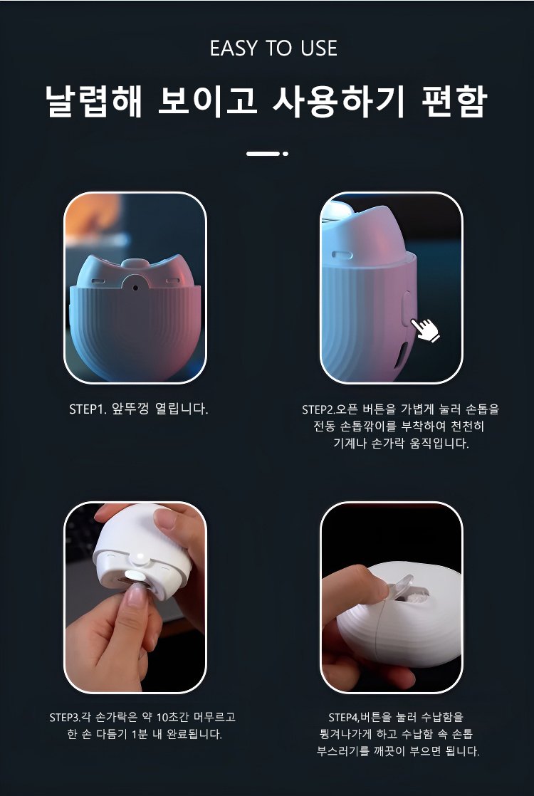 ● 충전식으로 간편하게 사용 가능하며, 무선으로 어디서든 손톱 관리를 할 수 있어 매우 편리합니다. ● 다양한 헤드 구성으로 손톱 다듬기, 연마, 광택 등 여러 단계의 손톱 관리를 하나의 기기로 완성할 수 있습니다. ● 저소음 저진동 설계로 야간이나 조용한 환경에서도 부담 없이 사용할 수 있어 가족 모두에게 적합합니다. ● 인체공학적 디자인과 미끄럼 방지 손잡이로 오랜 시간 사용해도 손에 무리가 가지 않습니다. ● USB 충전 방식으로 휴대성과 경제성을 동시에 갖추어 여행이나 외출 시에도 손쉽게 사용할 수 있습니다.