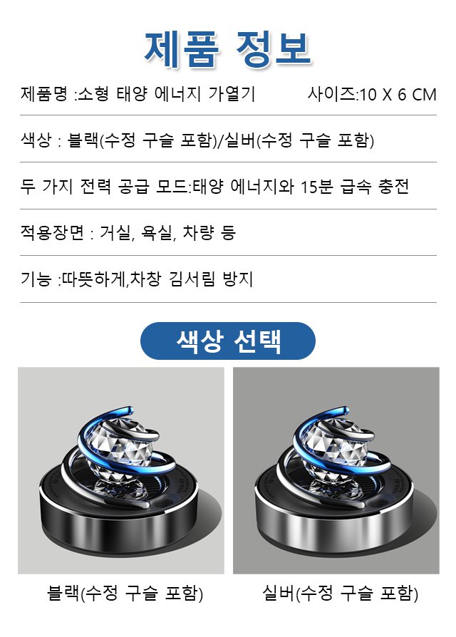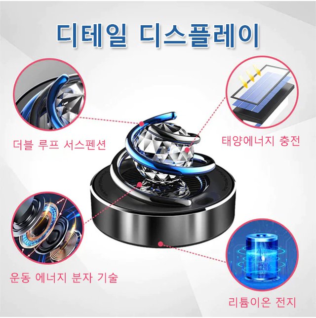 ● 태양광 에너지로 작동하여 별도의 배터리 교체나 충전이 필요 없어 편리하게 사용할 수 있습니다. ● 회전 기능이 있어 차량 내부 공기를 고르게 순환시켜 방향 효과를 극대화합니다. ● 제설 기능과 방향제가 일체형으로 설계되어 차량 내부를 쾌적하고 청결하게 유지할 수 있습니다. ● 세련된 디자인으로 차량 인테리어와 잘 어울리며, 설치도 간편해 누구나 쉽게 사용할 수 있습니다. ● 친환경 소재를 사용하여 안전하게 사용할 수 있고, 장기간 사용해도 향이 오래 지속됩니다.